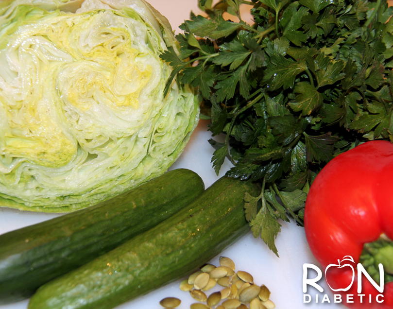 Порезать салат айсберг, перец, огурцы, петрушку, всё посолить. Насыпать семечек тыквы. Добавить молотого кунжута или конжутный жмых с льняным маслом.