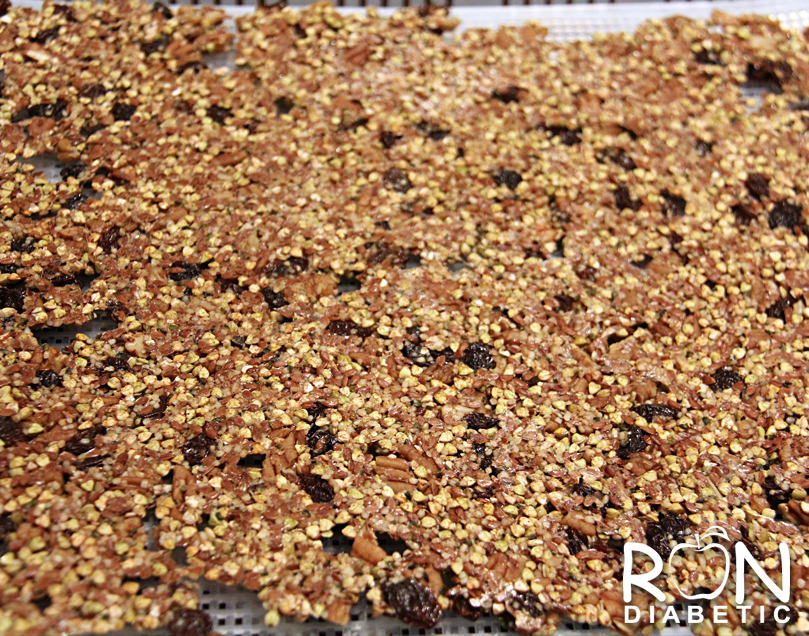 Когда верхний слой подсохнет даже с одной сторны, то вся эта масса будет как бы склеенна между собой. Чтобы она не рассыпалась/разламывалась при переварачивании, я сверху на поддон с гранолой кладу свободный поддон (без селиконового листа, только лист с дырочками) и придерживая два поддона быстро переварачиваю. Убираю верхний поддон и силиконовый лист и ставлю в сушку еще на часов 12 при темп. 40С.