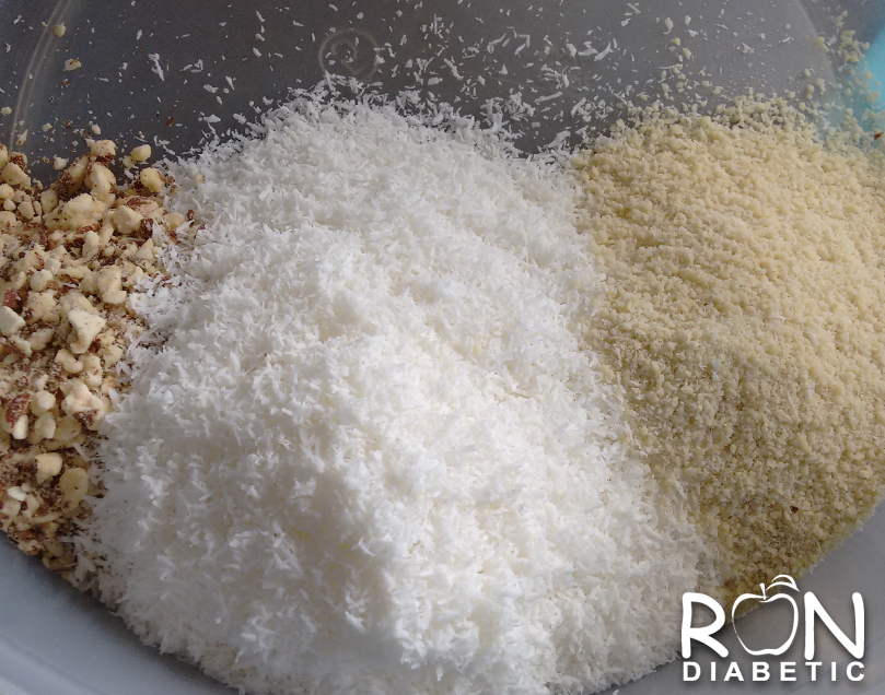 Положить несладкий, тертый кокосовый орех, миндальную муку, соль и рубленый миндаль в большую миску и перемешать.